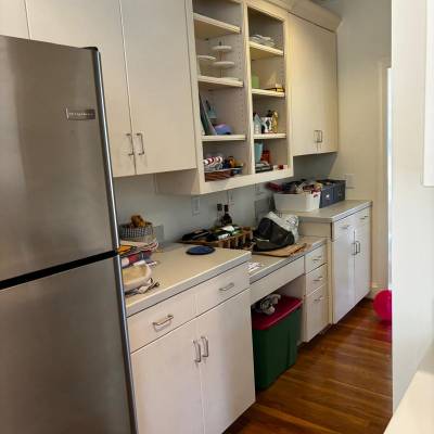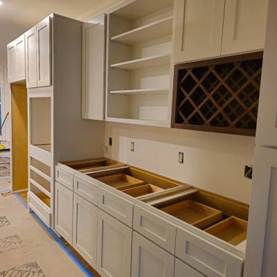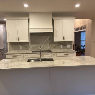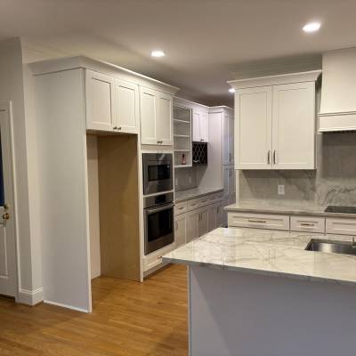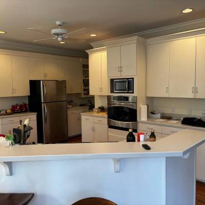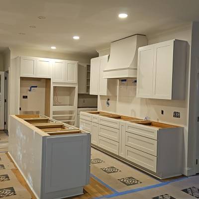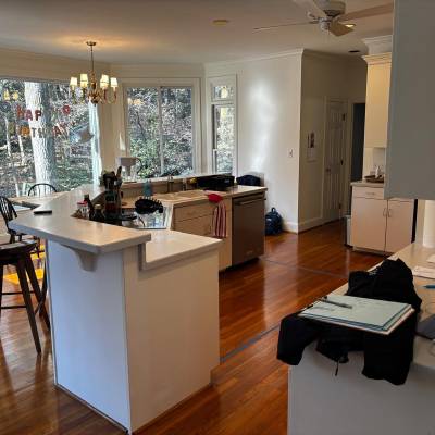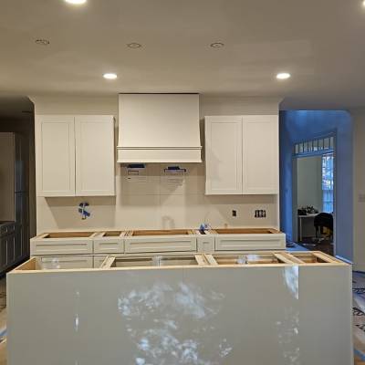 Demolition of existing cabinetry on sides and island , remove wall behind sink and cook top, new design and relocation of appliances . Electrical to relocate switches from back wall , relocate the fridge on end panel, run a new line for microwave ,remove pendant lights above island and install new ones, run a new line for microwave, run a new line 30 AMPS for new stove location. Plumbing to remove sink, run new lines from existing sink to new sink island location thru crawl space install new faucet and sink.Run a new line for the fridge and dishwasher Removal of bar wall , relocate electrical, plumbing and HVAC outlets Supply and install new custom painted wood cabinetry with quartzite countertops and full splash . Custom modified Hood for 400 CFM vent Wood floor refinish with water base coats and new show molding . Before Working on it After